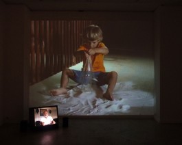 Lasse Andersson, a seaman's son, talks about his childhood that was dominated by women and his absent father . In addition to the interview which is shown on a monitor, there is a background projection of a little boy playing with sand and an empty bottle. The video installation reveals the discrepancy between the loaded image of the sailor, which stands to this day for an adventureous life at sea in a community with its own rules and the daily routine of his family members staying at home and organising their lives without their husband and father.
